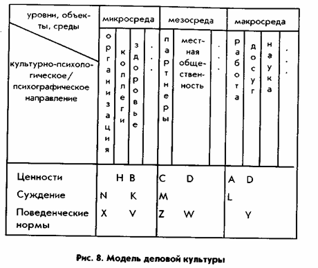 Описание и оценка культурных различий можно проводить с использованием структурных моделей. Так, модель деловой культуры можно представить в матричной форме, соединяющей два направления: культурно-психологическое, или психографическое (ценности, суждения, поведенческие нормы) и средо-объектные (элементы различных уровней среды - микро-, мезо- и макросред) (рис.8.). В клетках матрицы размещаются оценки значений (коды значений) конкретных объектов среды на ценностном, сужденческом и поведенческом уровне Оценки определяют приоритеты и содержание утверждений, характерных для конкретной деловой культуры.