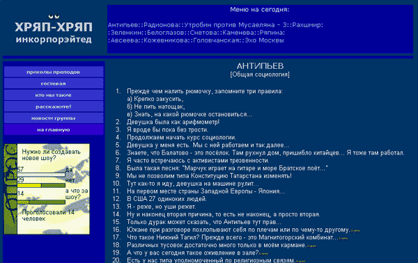 C 21 мая 2001 года в интернете существует этот сайт. Поначалу он размещался по адресу kirnik.narod.ru и включал только приколы преподавателей да небольшие автобиографии членов нашей небольшой группы.